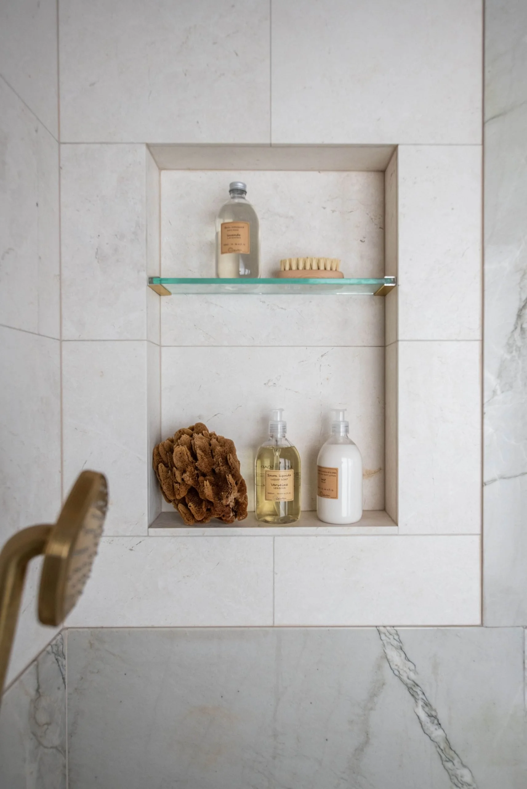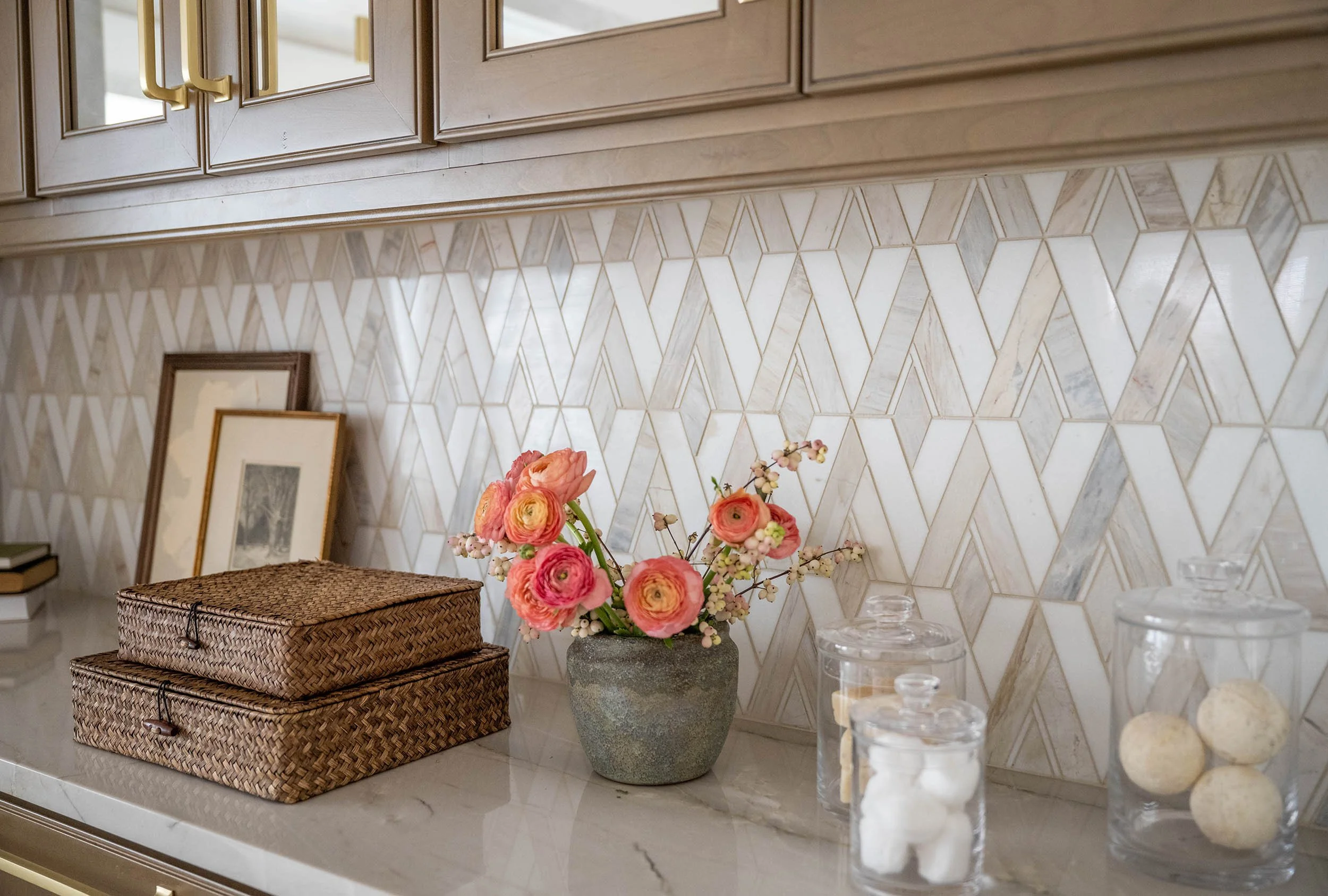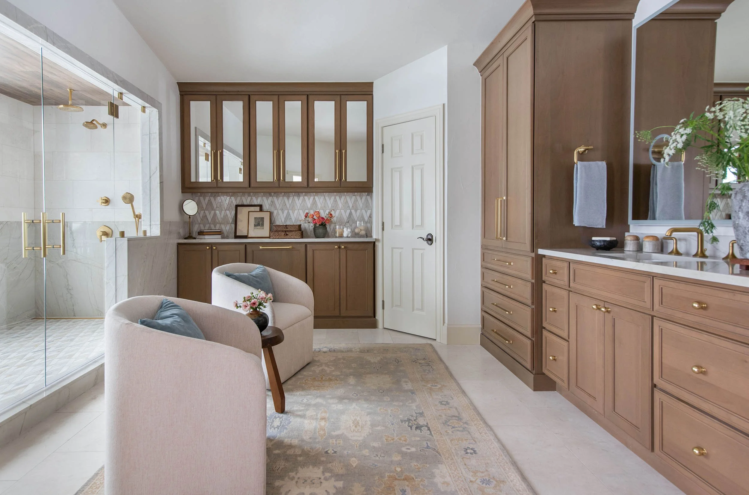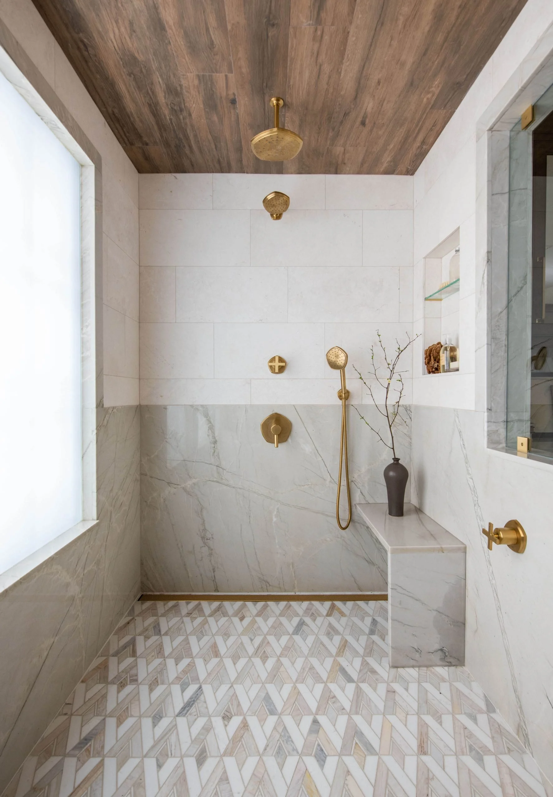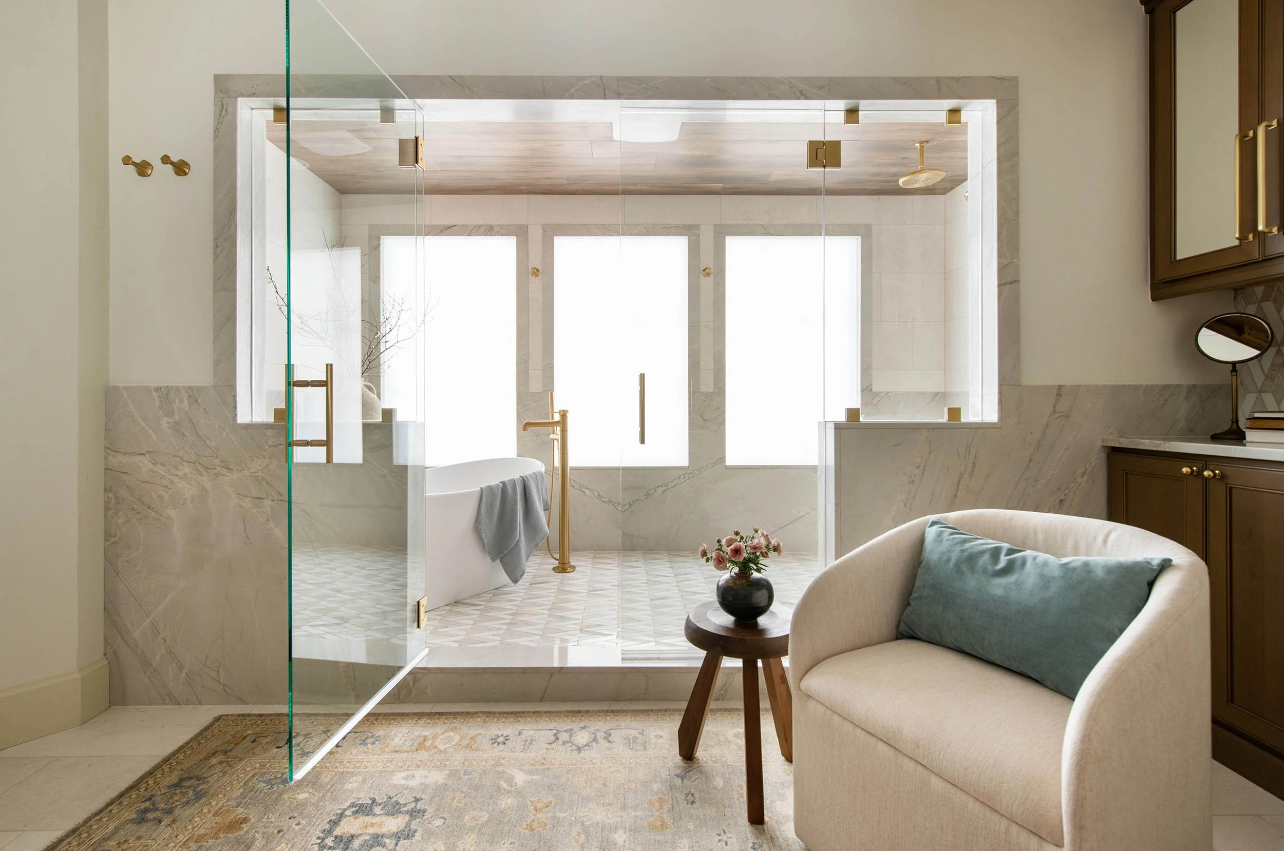 This Denver bathroom was completely reimagined to feel like a serene, spa-inspired escape. By creating a wet room concept, we maximized functionality without sacrificing elegance. Marble mosaic tile, warm wood cabinetry, brass fixtures, and a slab wainscot create subtle contrast and texture, while the modern glass enclosures preserve a sense of openness. What was once a space dictated by awkward window placement is now a calming retreat filled with sophisticated materials, soft light, and plenty of bubble baths.